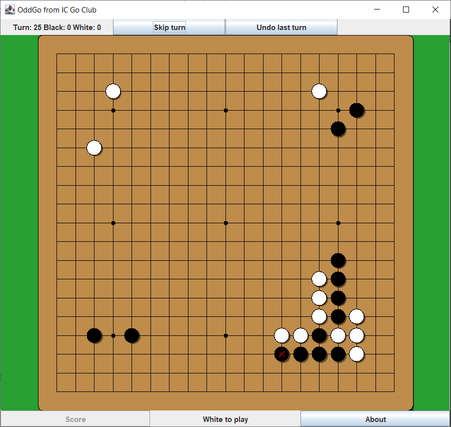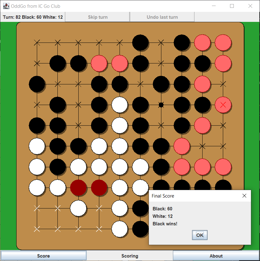 End the game by skipping both players' turns. Identify dead groups and territories, and OddGo will calculate the score.